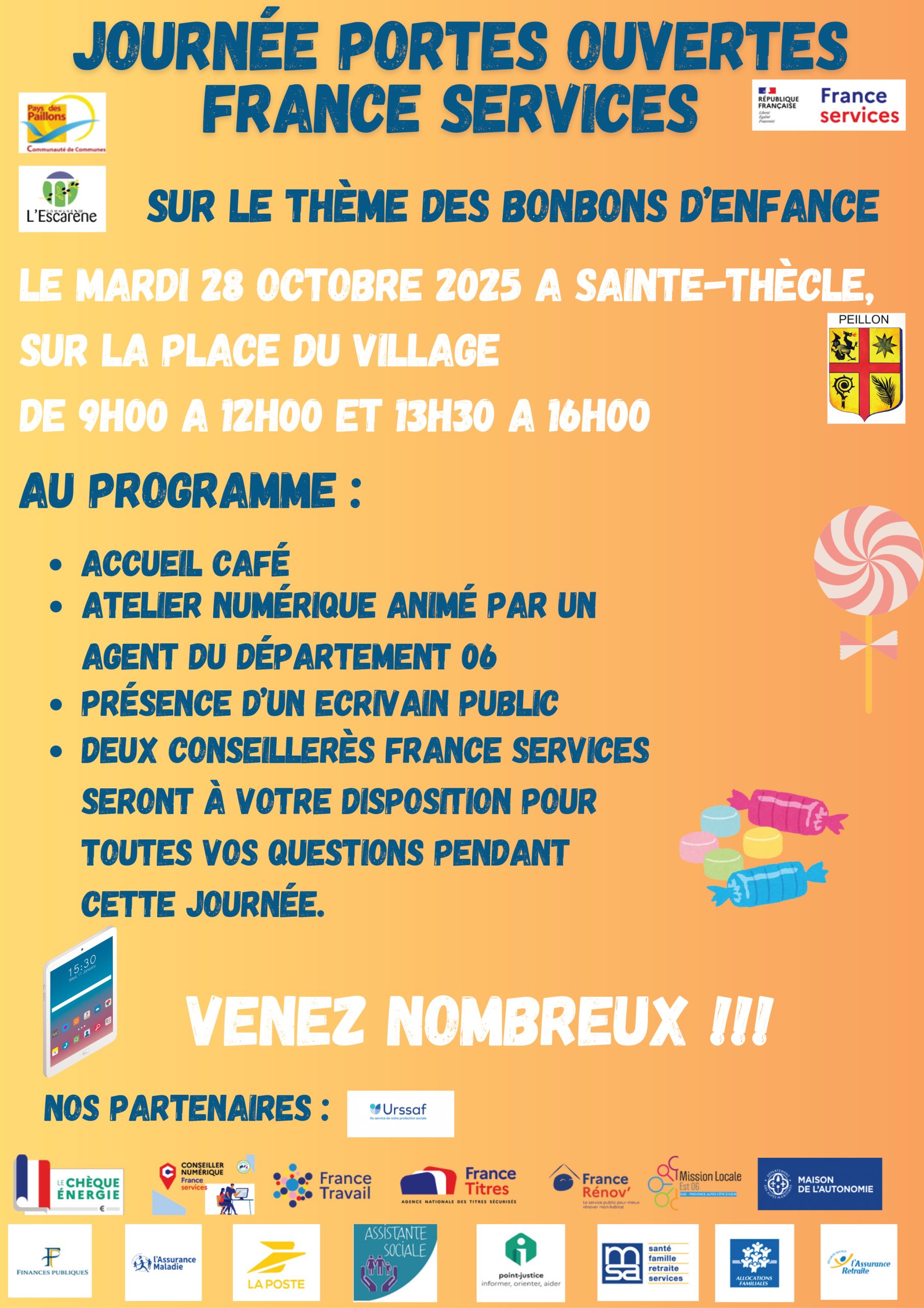 Le mardi 28 octobre 2025 , à partir de 9h, aura lieu la journée portes ouvertes « France Services » sur la place de l’Eglise à Peillon.