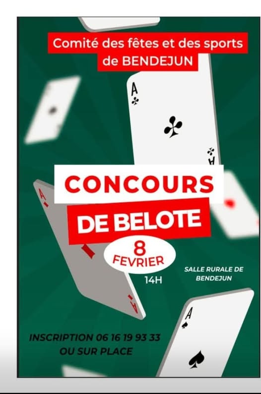 Le dimanche 8 février 2026, à 14h, venez participer au concours de belote, à la salle rurale de Bendejun. Inscriptions au 06 16 19 93 33 ou sur place Organisé