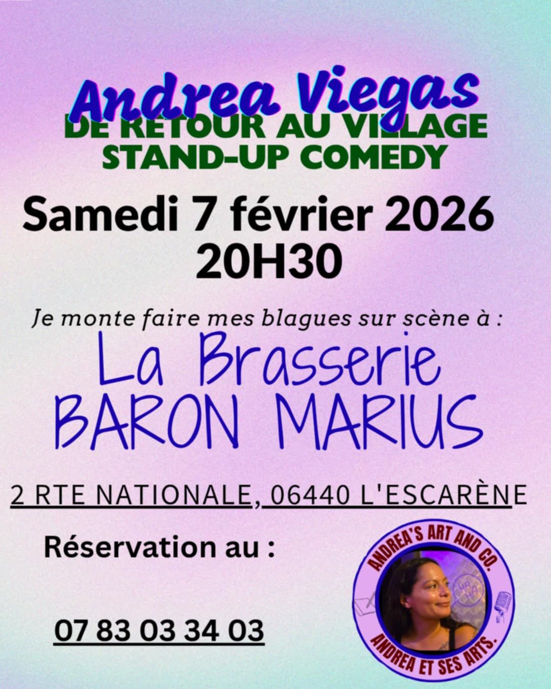 Samedi 7 février 2026 à 20h30, à la brasserie BARON MARIUS, aura lieu le Stand up comedy de Andrea Viegas.