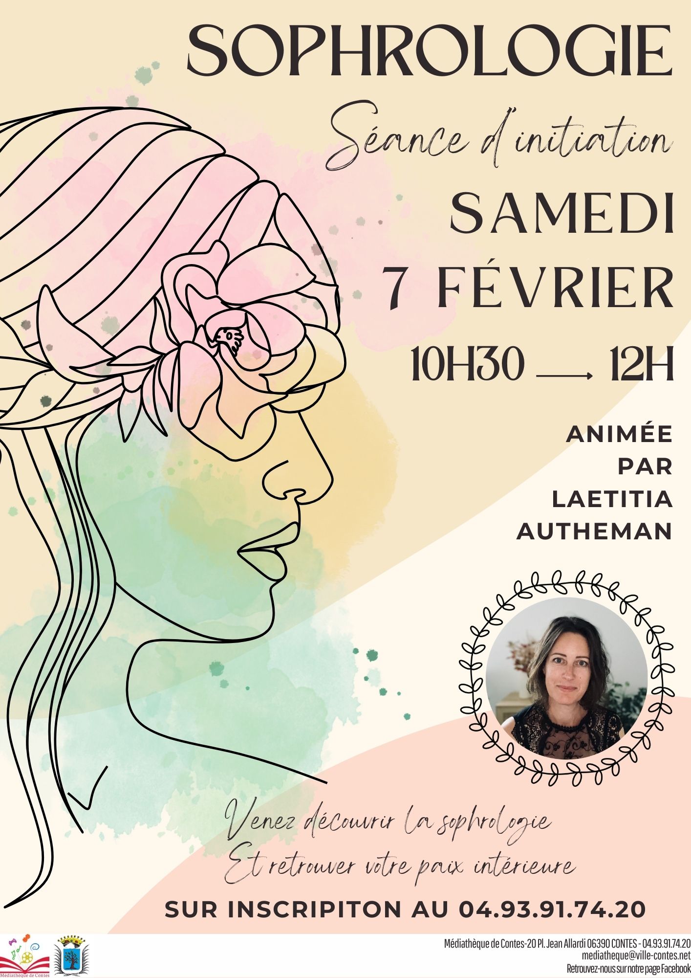 Samedi 7 février 2026, à 10h30, à la médiathèque, séance d'initiation à la sophrologie. De 10h30 à 12h. Animé par Laetitia Authman Venez découvrir la sophrologue et