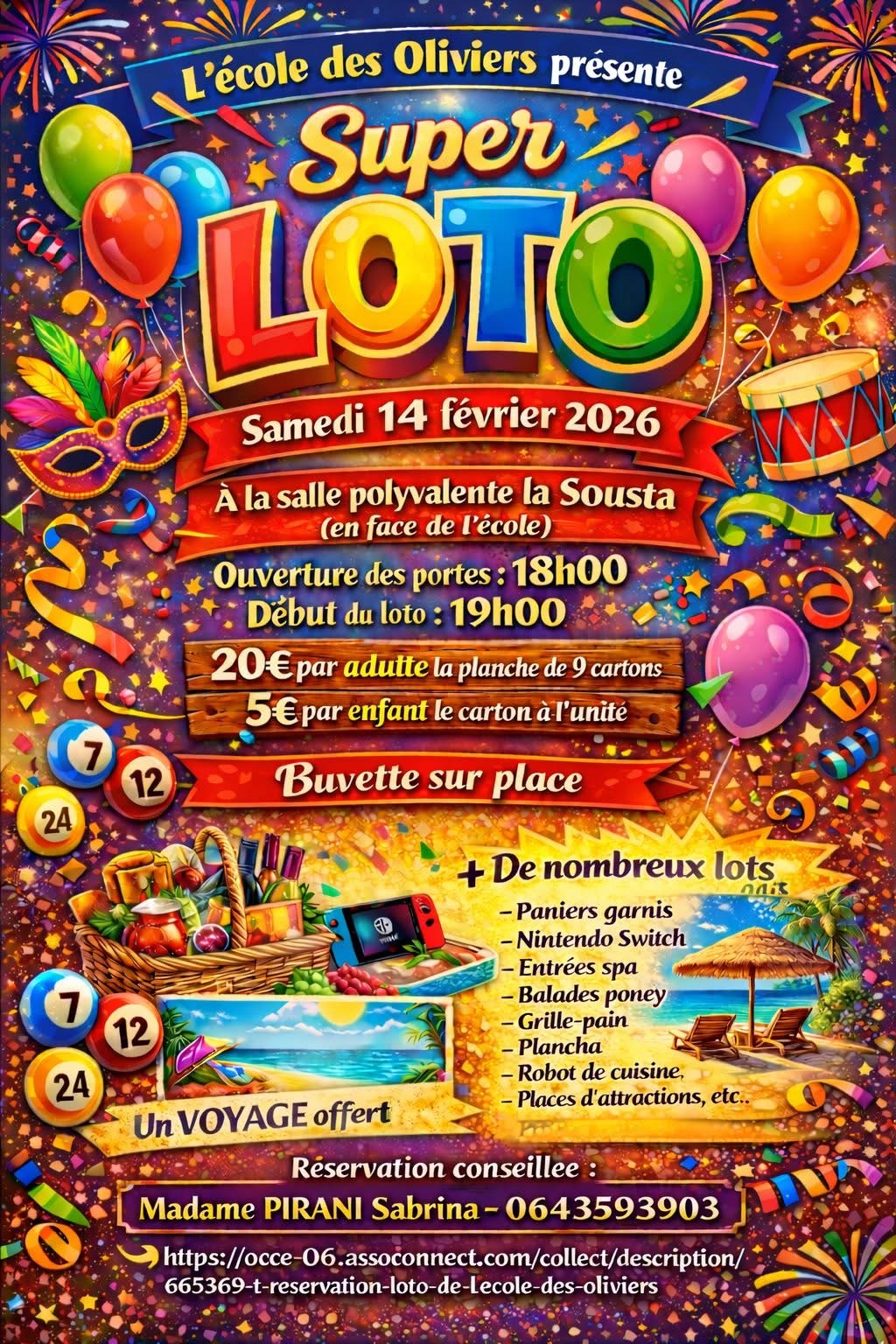 Samedi 14 février 2026, à 19h, l’école des Oliviers organise un super loto sur la salle de la Sousta.