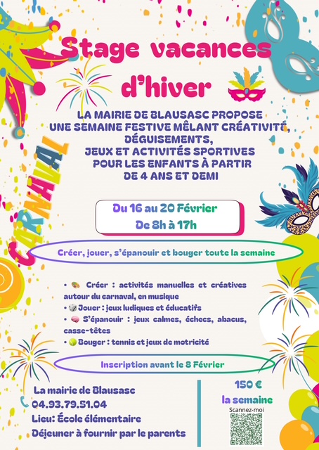 Du 16 au 20 février 2026, la mairie de Blausasc organise un stage vacances