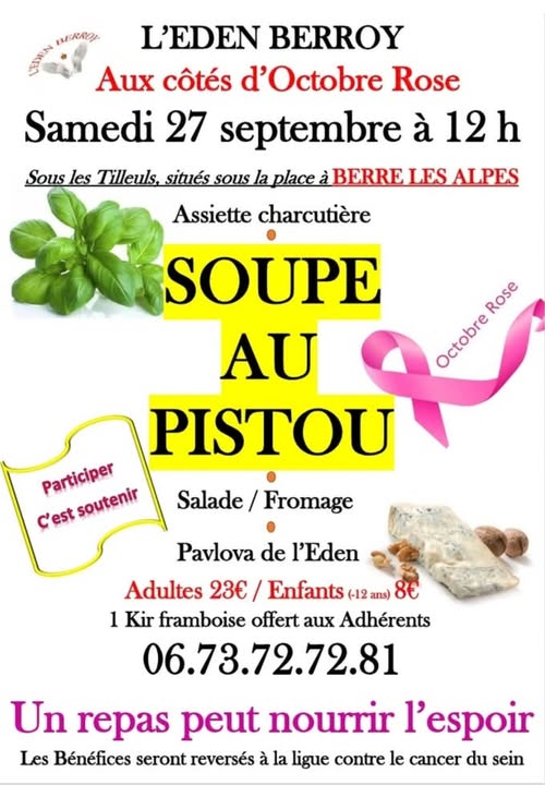 Samedi 27 septembre 2025, sur la place des tilleuls, à 12h, aura lieu la soupe au pistou organisés par L’Eden Berroy, dans le cadre d’octobre rose.