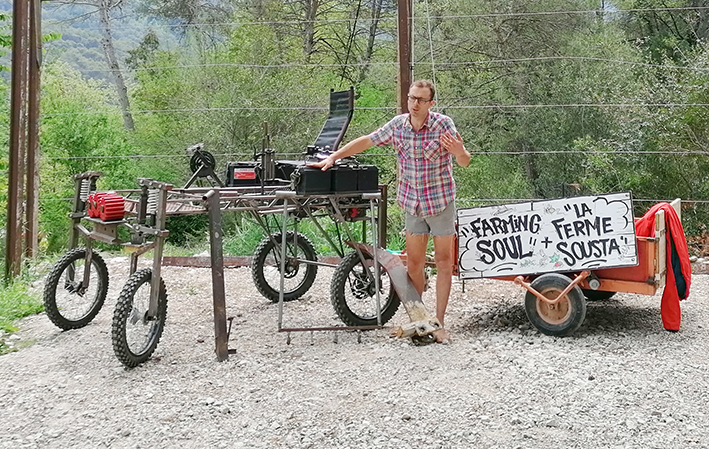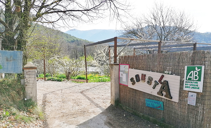 A la ferme de la Sousta, Rudy favorise le concept de permaculture, qui consiste à être respectueux de la biodiversité, de l’humain et à imiter le fonctionnement des écosystèmes naturels. Leur technique culturale est de planter dans une terre sans labour. Ce processus permet d’enrichir le sol par les amas de broyats tout en préservant l’habitat des êtres vivants du sol et des microorganismes (vers de terre, insectes…). Parallèlement à cela il utilise les outils qu’il a lui-même fabriqué comme la canne à planter, le Tasstou, ou leur célèbre Tornado (engin ergonomique sur mesure qui permet de biner en pédalant).