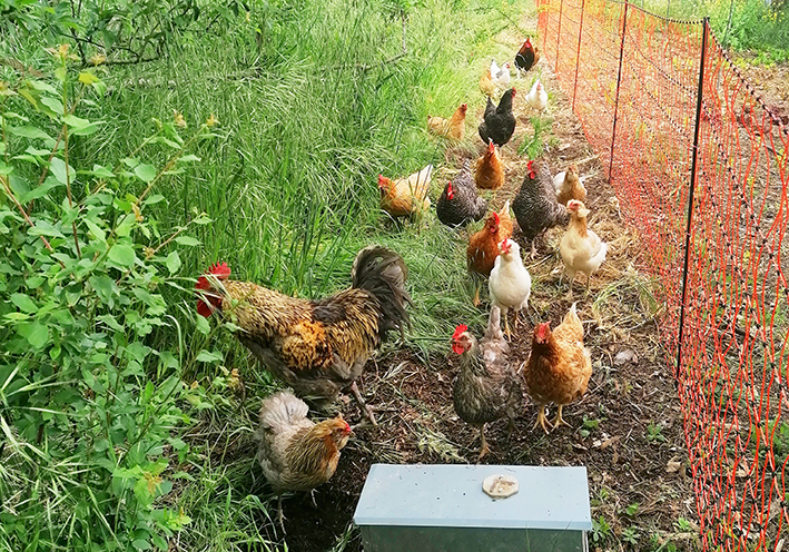 Du côté des cocottes, le poulailler fonctionne de manière autonome. Les deux coqs Quasimodo, BigPiou, et les poules Poupou et ses copines parcourent un espace délimité et mobile, pour se nourrir exclusivement de verdure qu’offre la nature. A cela l’agriculteur leur donnent des apports en céréales bio, bien évidemment.