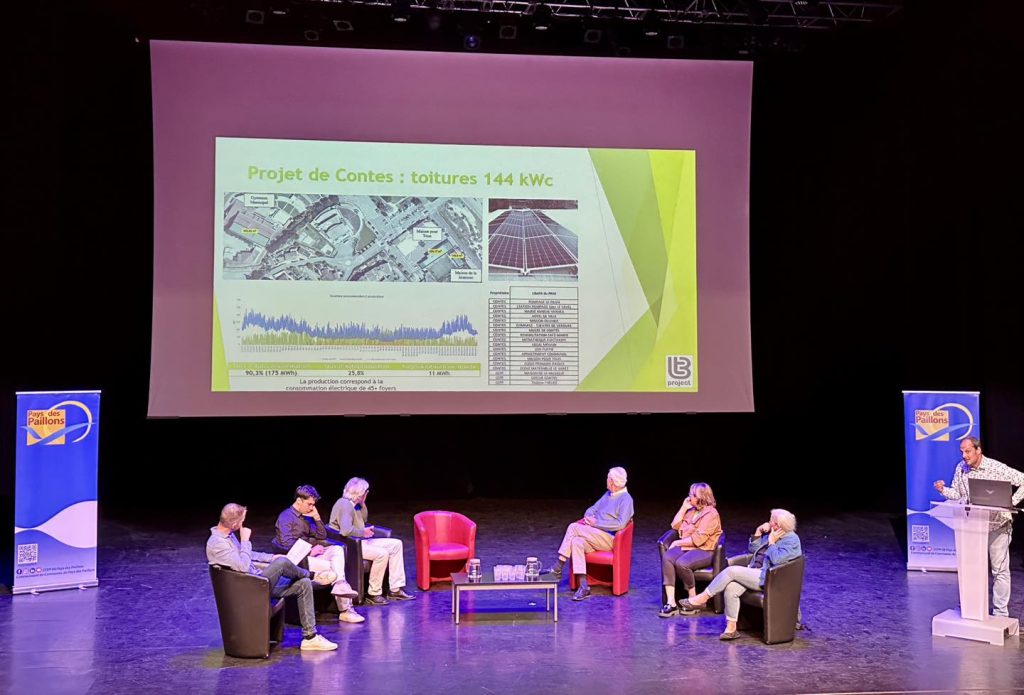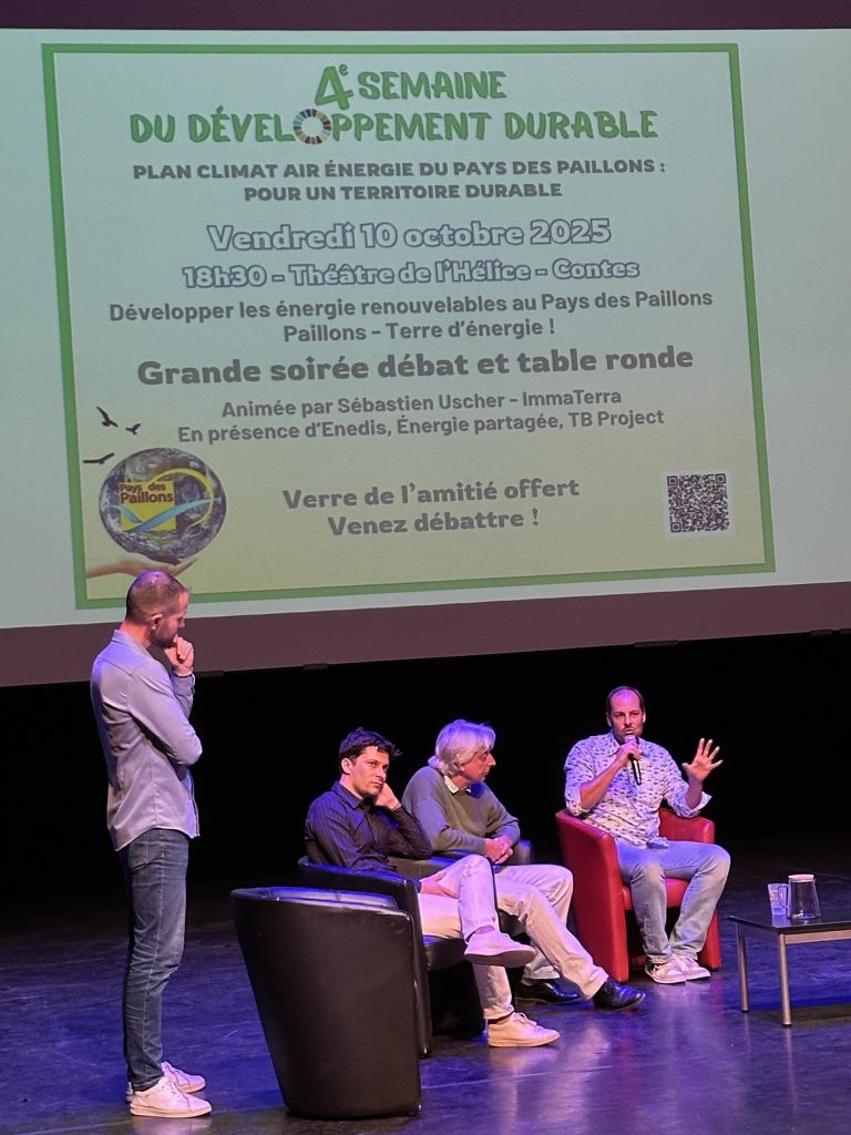 Une grande soirée-débat s’est tenue au Théâtre de l’Hélice à Contes, animée par Sebastien Uscher d’ImmaTerra. Les partenaires Enedis, Énergie Partagée, TB Project et les élus du territoire ont échangé sur le développement des énergies renouvelables locales.
